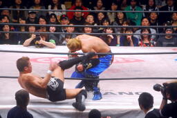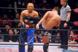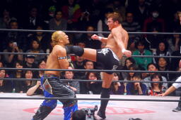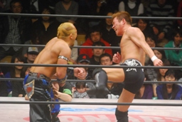 望月を場外に落としトペ狙う、望月はカウンターのキック(右写真)。