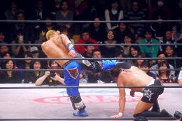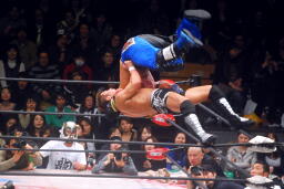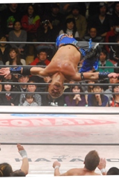 セカンドロープに飛び乗ってラ・ケブラーダ(右写真)。