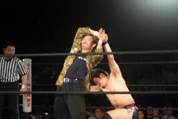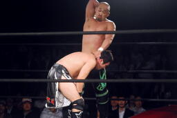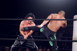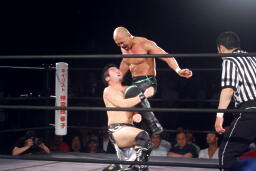 長井ミドルキック2発、ブレーンバスター(左写真)、カウント2。南野にタッチ。