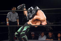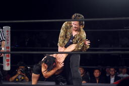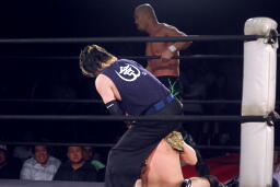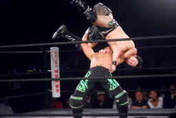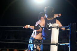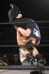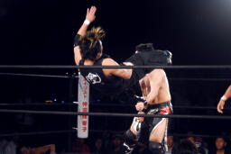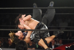 長井潜り込んでダブルリストアームサルト(左写真)、ネックロックに。コーナーに引き込んで南野にタッチ。