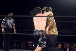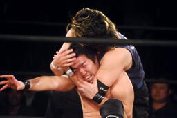 長井エルボースタッブ2発(左写真)、ギロチンドロップ、カウント2。スリーパー、小川内ロープ。南野にタッチ。