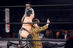 南野首投げからスリーパー(右写真)、小川内ロープ。長井にタッチ。10分経過。