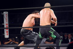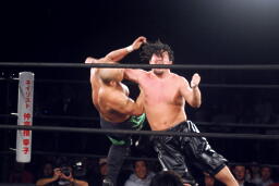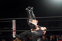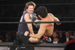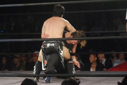 小川内ガットショット、首投げからスリーパー(左写真)、南野はヒジでブレーク、小川内を場外に落とす。
