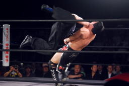小川内ロープに飛ぶ、南野キャッチしてマンハッタンドロップ(左写真)。