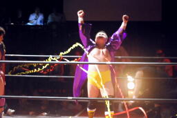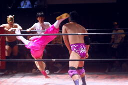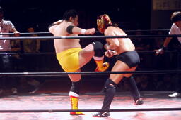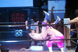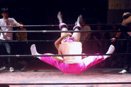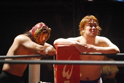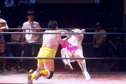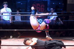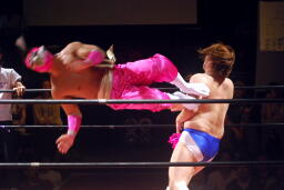 ディーノとはやぶちゃがリングイン。ロックアップ、ディーノがヘッドロック、はやぶちゃロープに振ってショルダーブロックの打ち合い、はやぶちゃはリープフロッグからドロップキック(右写真)。