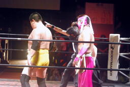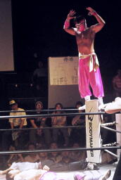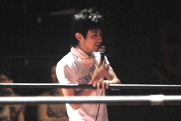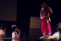 ここでキアイリュウケンエッちゃんと一緒に入って来たガリバー木下マサ田所(プロレスリング紫焔のリングアナ)が突如マイク(左写真)。「今日この3人が集まったのはどういうことかわかるか?俺にも分からん。10年前、大阪を血の海に沈めたこの伝説のユニット。その名前は・・・俺にも分からん。」