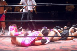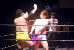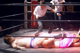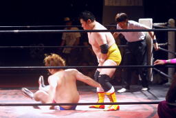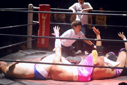 エッちゃんはやぶちゃに逆水平連打、ハーフネルソンスープレックス(右写真)。実況席「危ない角度ですねえ。」「若気の至りスープレックスですね。」