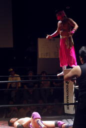 尿道がコーナーに上がって3人がかりのスーパーパワーボム。尿道が先に着地(左写真)。実況席「優しい落とし方ですね。」ディーノとアンデレがカット。