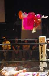 はやぶちゃがコーナーに上がってファイヤーバードスプラッシュ狙う(左写真)、