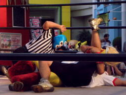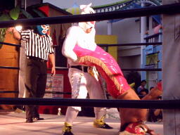 メリーさんカバー(右写真)、カウント2。スワン抗議、メリーさんまた謝る。