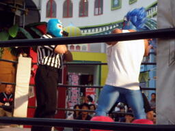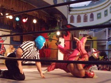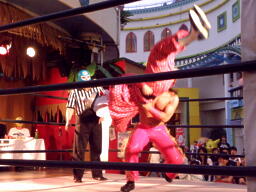 メリーさんロープに飛ぶ、キッドキャッチしてケブラドーラ・コン・ヒーロ(左写真)。