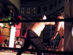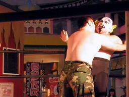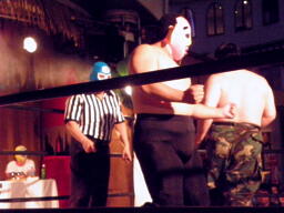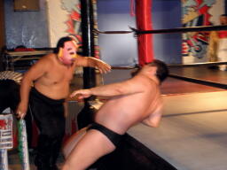 米兵戻る。ロックアップ、米兵ヘッドロック(左写真)、ももタローロープに振る、ショルダーブロックの打ち合い。