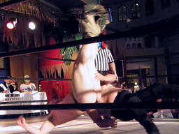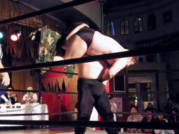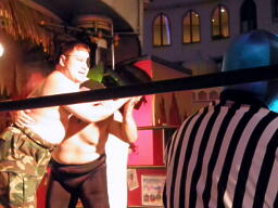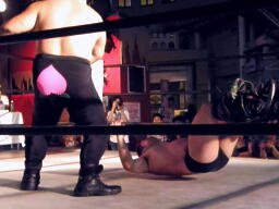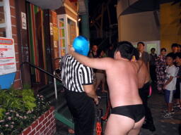 酒を飲んだ後でぐるぐる回されて酔っ払ったらしい(左写真)。Mr.ブルーレフェリーが場外カウント20を数え両者リングアウト。