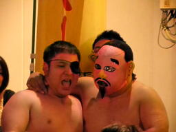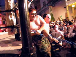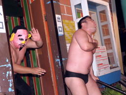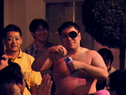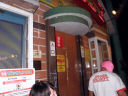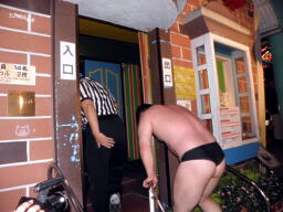 米兵場外エスケープ(右写真)。ももタロー後を追う。米兵は客のコロナビールを口に含んでももタローに噴き掛ける。