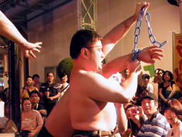 観客に協力させて締め上げる(左写真)。