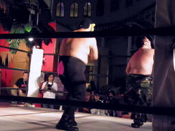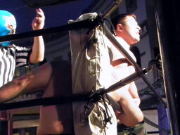 再度ロックアップ、今度は米兵がロープに押し込む(左写真)、ブレーク際に著チョップ。