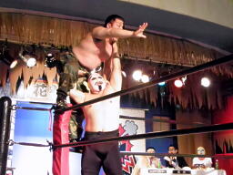 米兵がコーナーに振る、ももタロー切り返す、米兵フレアーフリップでエプロンに出てコーナーに上るがももタローキャッチ(右写真)、