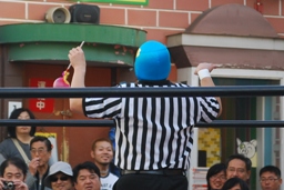 Mr.ブルーが吹き戻しに熱中してる間にメリーさんは急所蹴り(右写真)。