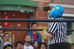 Mr.ブルー今度はメリーさんに渡されたシャボン玉に熱中(左写真)。