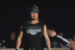 王者ヤス・ウラノが客席から入場(右写真)。あれ、いつもベルトは上半身に巻きつけてるのに今日はないぞ?