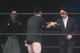 なぜか挑戦者の関根からベルトが返還される(左写真)。