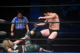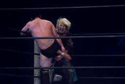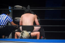 関根コーナーに振って突っ込む、ウラノはカウンターのキック。何回も繰り返すが関根は足をキャッチすると肩に担いでカミカゼに(左写真)、カウント2。10分経過。