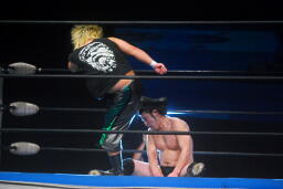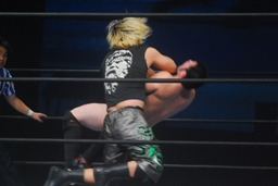 関根ようやくロープに振る、ウラノショルダーブロック。ウラノロープに飛ぶ、関根ヒップトス(右写真)からドロップキック。