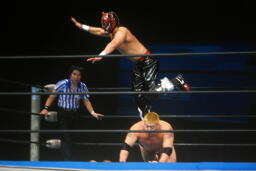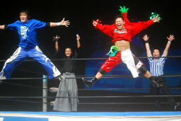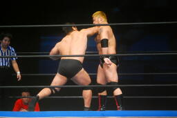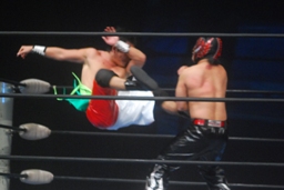 ロープワーク、コーナーワークからトマトはアームドラッグ、タイガースはスカし(左写真)ドロップキック。滝澤と石川にタッチ。