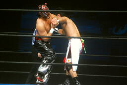 3回目(右写真)で両者ダウン、滝澤と石川にタッチ。