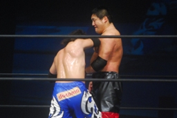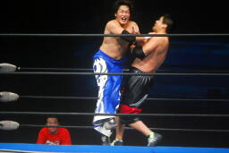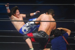 火野ショルダーブロック(右写真)、関本が入るが火野はフライングショルダーブロック。
