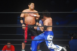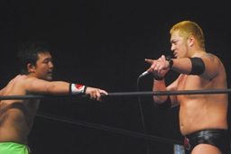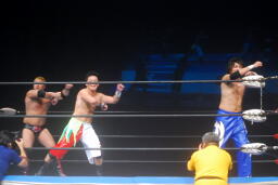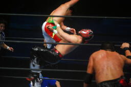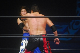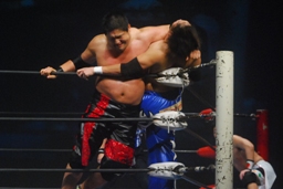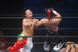 関本が入ってパワーボム狙う、火野がラリアットで阻止。タイガース投げっ放しジャーマン、トマトすぐに立ち上がってランニングエルボー(右写真)。