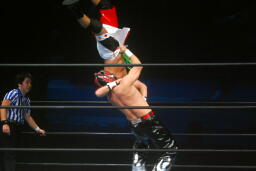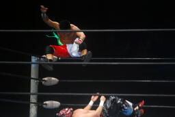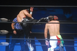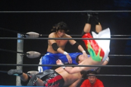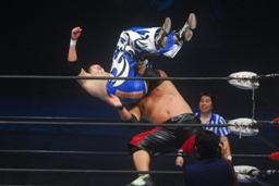 コーナーに振ってヘッドアタック、コーナー2段目に上ってダイビングギロチンドロップ(左写真)、カウント2。
