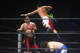 滝澤は石川をコーナーに振って串刺しエルボー、トマトも滝澤を踏み台にして串刺しエルボー(右写真)。