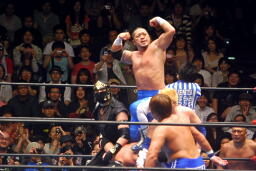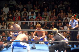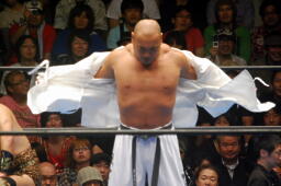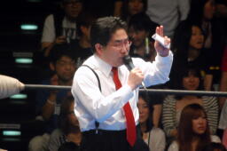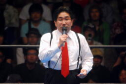 まだ負傷完治していないと思われるMen's テイオー、そして最後にディック東郷が入場(右写真)。篠塚さんがディック東郷をコールするのもあと2回かな。