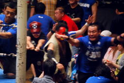 海援隊★DXの入場前に海援隊のテーマと全員のテーマをミックスした今日限りの入場テーマが。TAKA、FUNAKIに続き当初セコンドで来る予定だったがカズ・ハヤシの欠場により試合に出ることになった中島半蔵入場(左写真)。篠塚さんのコールは「HANZO〜」