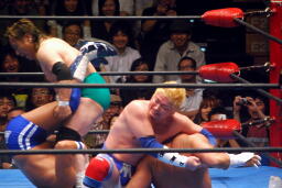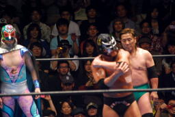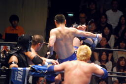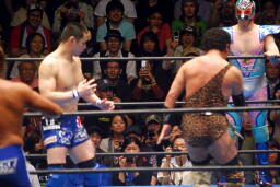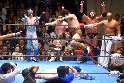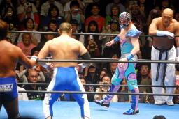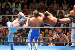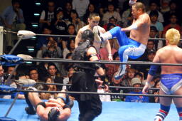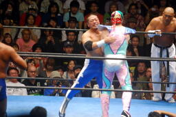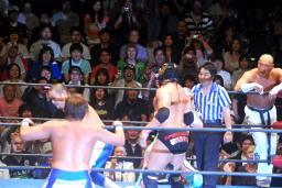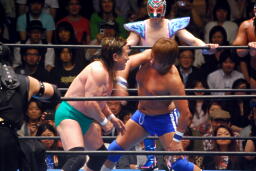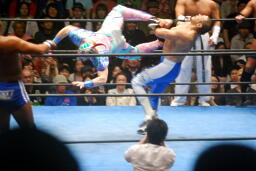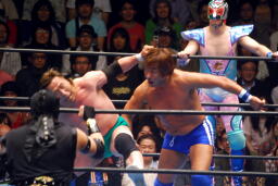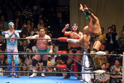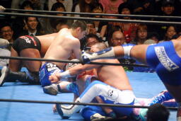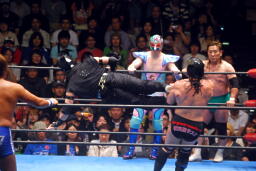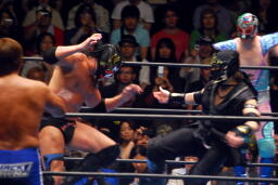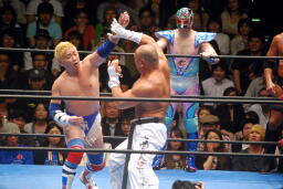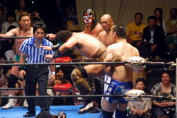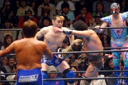 サスケが羽交い絞めしてデルフィンが大阪臨海アッパー、東郷かわしてサスケに誤爆(右写真)。