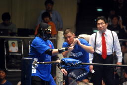 セコンドのカズ・ハヤシもコールされる(左写真)。