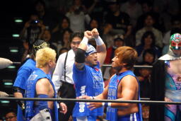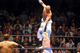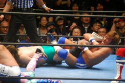 テイオーがリングに残りサスケに長滞空時間ブレーンバスター(左写真)、FUNAKIにタッチ。