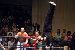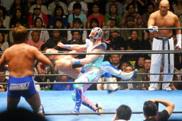 半蔵ソバット、サスケは下からヘッドシザーズに捕えコークスクリューでホイップ。半蔵ドロップキック(右写真)、サスケを場外に落とす。トペはフェイントのみFUNAKIと浜田にタッチ。