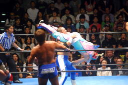ロープ渡りからダイビングチョップ(右写真)、テイオーかわす。