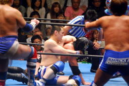 二歩だけですぐにエルボードロップに(右写真)。TAKAヘッドロックからフライングメイヤー、ヨネヘッドシザーズでブレーク。半蔵とサスケにタッチ。