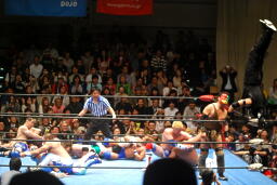 海援隊★DXはサスケを捕えて代わる代わるストンピング。TAKAがボディスラムで投げてランニングエルボードロップ5連発。最後は東郷が高くジャンプしてエルボードロップ(左写真)。