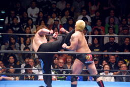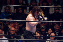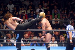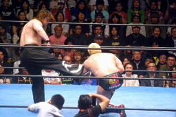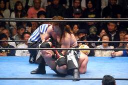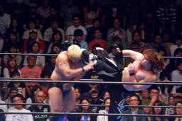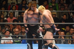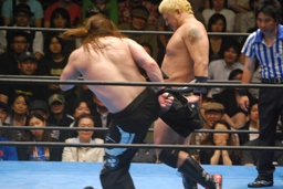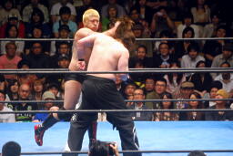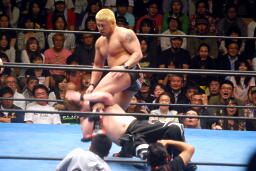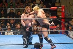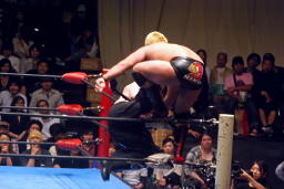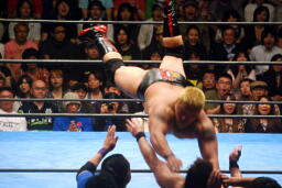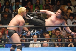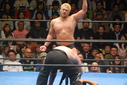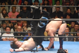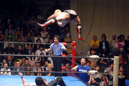 コーナーに上ってフロッグスプラッシュ(左写真)、カウント2。