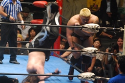 火野は真霜を場外に突き落とし、トップロープノータッチのプランチャ(左写真)。