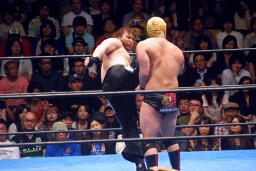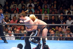 両者カウント9で立ち上がる。火野コーナーに振って串刺しラリアット(右写真)。