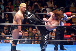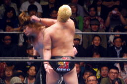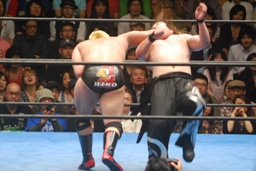 火野ついにFuckin' Bomb決める(左写真)、カバーが遅れカウントは2どまり。