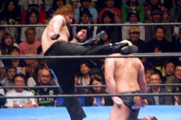 火野が腕パンチ出そうとするがカウンターでトラースキック(左写真)。