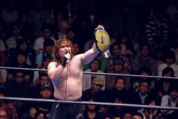 真霜「久しぶりに、2年以上ぶりに、子の後楽園ホール、メインイベント、タイトルマッチ、勝利してみるこの景色、最高ですよ!でもよ、俺はそれに浸っているわけにはいかなくて、STRONGEST-K、タッグとハードコアタッグ、そしてこのベルトも獲った。三冠王だ。コミッショナー、次7月31日スーパービッグショー、このベルトの防衛戦、組まれる予定になってるはずです。組まれるんですよね?」(左写真)