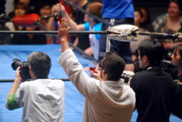 挑戦希望者がわらわらとリングサイドに(左写真)。