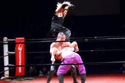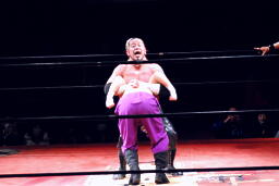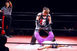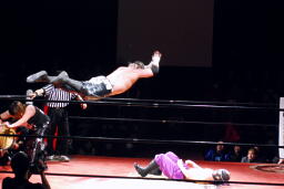 パールハーバースプラッシュ(右写真)、しかし菅原がセットした場所が遠かったせいで当たりが浅く政宗は2でキックアウト。葛西は菅原にタッチ。